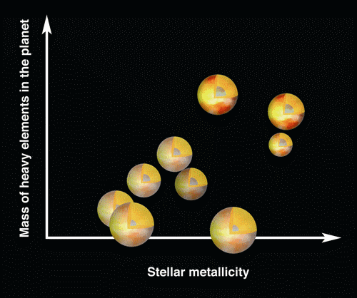 Fig. 2 – Correlation between the amount of heavy elements in the transiting planets and the metallicity of their parent stars.