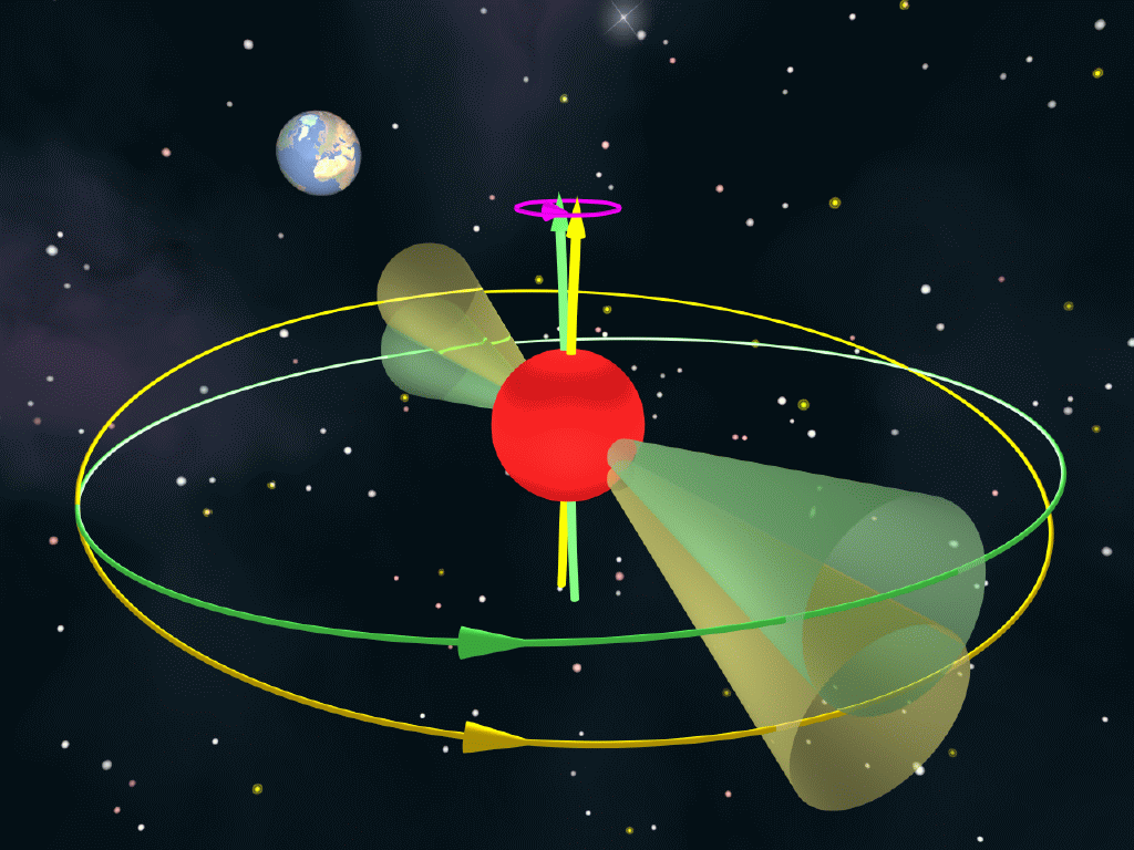 Illustration Caption: [http://www.jb.man.ac.uk/news/neutronstar/] The wobbling (or precession) causes the rotation axis of the pulsar to follow a circle-like motion in time (see yellow and green axes at different epochs). The motion is very much like the wobble of a top or gyroscope. As a result, we see the cone-like lighthouse beam of the radio pulsar under different angles, resulting in the observed changes in pulse shape and arrival times. (Image by M. Kramer)