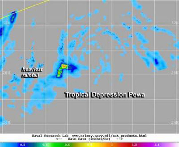 NASA’s TRMM/Tropical Rainfall Measuring Mission satellite captured Pewa’s waning rainfall on Aug. 25 at 14:17 UTC/10:17 a.m. EDT. TRMM’s precipitation radar data showed moderate rainfall in a small area in the southwestern quadrant of the depression. At that time, most of the system either had light rain or is rain-free. By Aug. 26, Pewa passed in the Pacific.