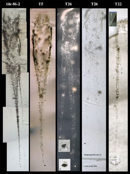 There was a general consensus that many of comet particles are built like loose dirt-clods composed both of “large strong rocks” as well as very fine powdery materials. The fine and coarse materials are only loosely held together and they separated during collection in low-density aerogel to form tracks shaped like ginseng, turnips or carrots. The larger components form root-like holes that lead to the bottoms of the tracks, and the smaller components stopped closer to the tops of the tracks, forming bulbous turnip-like cavities. The longest tracks are about two centimeters long and up half a centimeter wide. Analysis of material in the bulbs has provided the first information on organic materials in the samples.