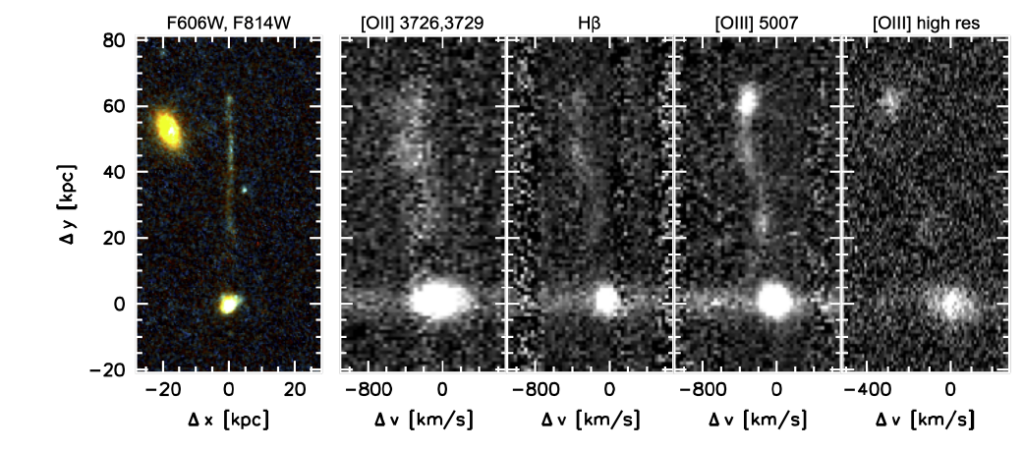 “We think we’re seeing a wake behind the black hole where the gas cools and is able to form stars. So, we’re looking at star formation trailing the black hole,” said van Dokkum. “What we’re seeing is the aftermath. Like the wake behind a ship, we’re seeing the wake behind the black hole.”