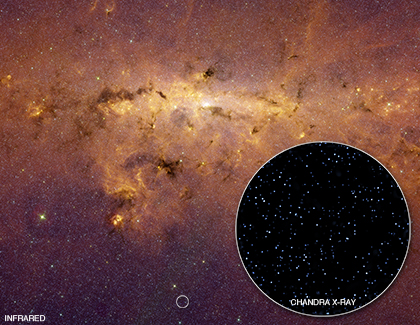 This image shows an infrared view from the Spitzer Space Telescope of the central region of the Milky Way, with a pullout showing a Chandra image of a region located only 1.4 degrees away from the center of the galaxy.